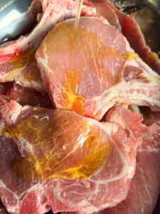 - Drizzle the olive oil all over the pork chops, then add in the liquid smoke.