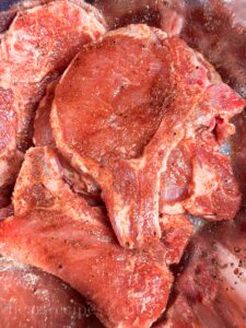 - Sprinkle the seasonings all over the pork chops and massage in. make sure all of the surfaced are coated with seasonings.