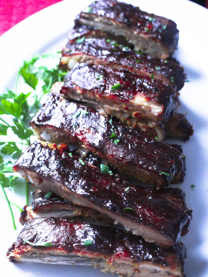 I used a lot of sauce for my ribs. You can use less if you choose. Once that the ribs were done, I cut them and then poured on more sauce. Instead of pouring the sauce onto the ribs, like I did, you can serve the remaining sauce on the side.