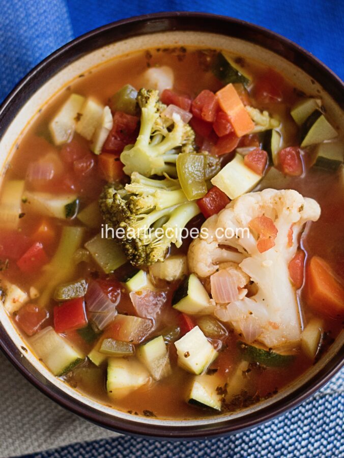 - Stir, then add in the tomatoes, mixed vegetables, and broth. Next turn the heat up to high.