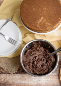 - Spread an even layer of chocolate buttercream over the top.