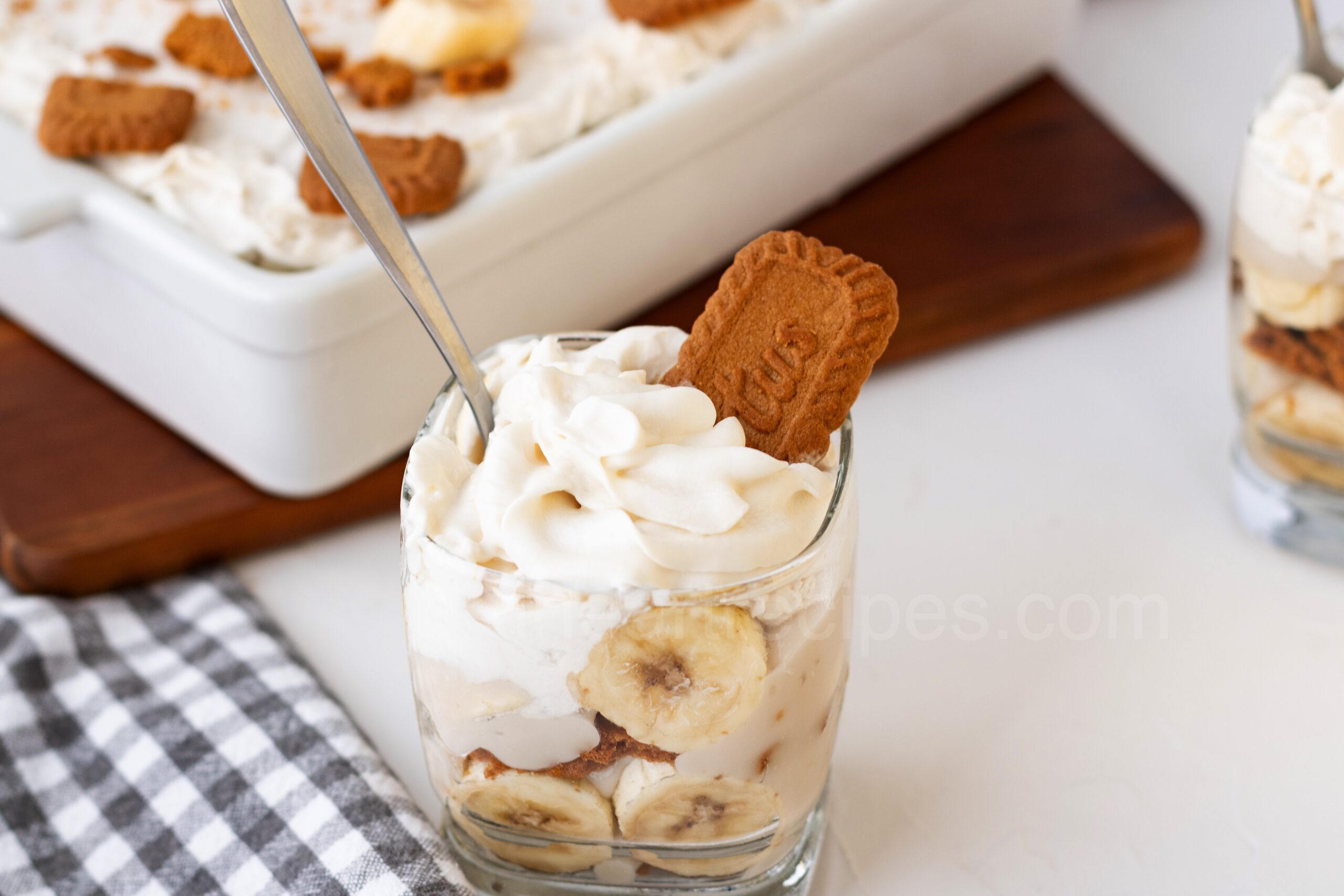 - In a trifle dish or a large serving bowl, start with a layer of Lotus Biscoff cookies, followed by a layer of sliced bananas, then a layer of the cooled vanilla pudding. Repeat the layers until all ingredients are used, ending with a layer of pudding.